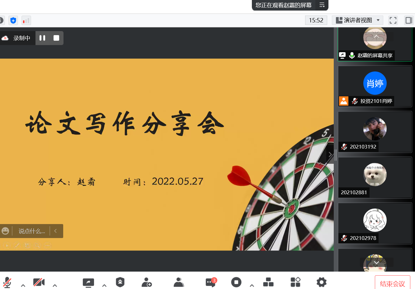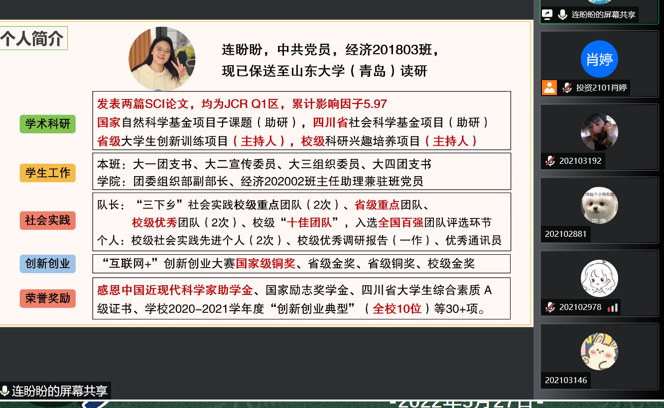 为提升我院学子的学术研究、学术论文写作兴趣,ylzzcom永利总站线路检测第二课堂与创新创业服务部于2022年5月27日下午16:30在线上腾讯会议,开展了“三趣汇”分享会——学术论文写作经验分享会,出席本次活动的嘉宾有经济2018级连盼盼,经济2019级宋一鸣,金融2019级闵锐,经济2019级赵霜,嘉宾们来自学院的各专业,有着较为丰富的学术论文写作经验,曾多次在SCI等收录期刊发表论文。
