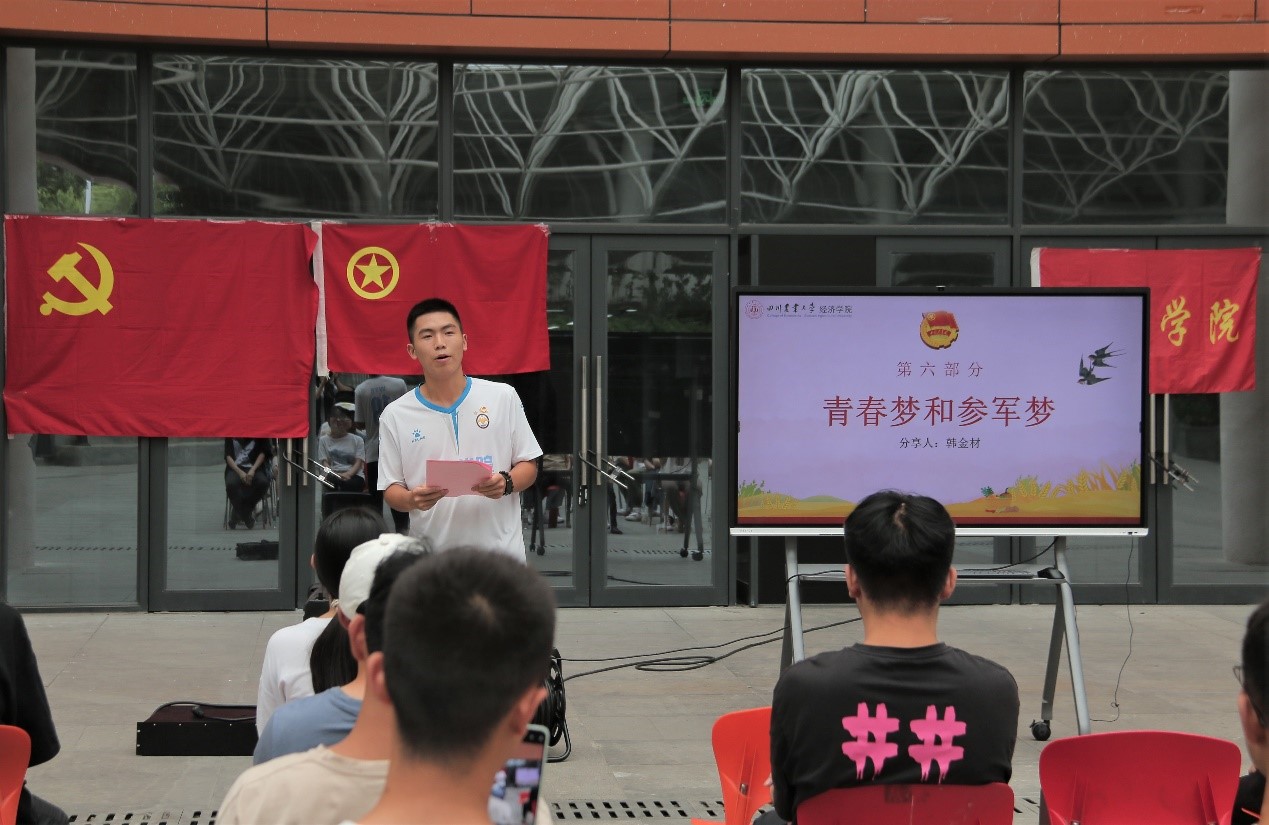 奋斗擦亮青春底色,实干担当时代重任。今年9月即将应征入伍的韩金材同学,讲述了自己与队友一起在足球队刻苦训练,首次拿下“川农杯”足球赛冠军的成长故事。艰苦的训练不仅锻造了他强健的体魄,足球队“敢争第一、敢打必胜”的团队精神也激励着他做出了在大一就应征入伍的决定。从绿茵场到训练场,足球梦对接军旅梦,韩金材用实际行动践行着“清澈的爱,只为中国”的青春誓言。