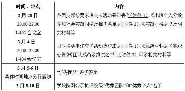 1.各支部请在2月28日前召开支部社会实践交流总结大会,支部成员均要参会,邀请非团员同学自愿参会。以个人分散实践和参加团队实践的同学均自愿在大会上作交流发言或成果展示。
