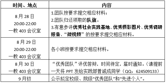 2.学院将于8月30日在1教403会议室(具体时间届时在队长群通知)举行“优秀团队”评优答辩,参选评优团队制作答辩PPT,以陈述5分钟,提问3分钟的形式进行答辩,请参评团队队长于8月29日18:00前将PPT发至实践部曾诚成处(QQ:624509133)