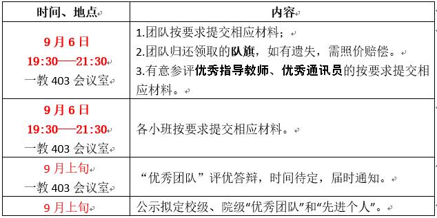 2.学院将于9月11日前(具体时间届时在队长群通知)举行“优秀团队”评优答辩,参选评优团队制作答辩PPT,以陈述3分钟,提问2分钟的形式进行答辩。
