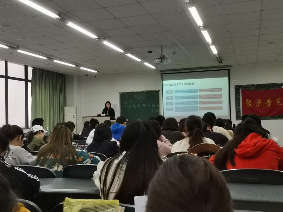 在讲座中,郭丹老师秉承着严谨认真的态度,从她任记者一职到她作为HR,向同学们分享关于她的就业经历。之后,整个讲座从职业规划、简历撰写、笔试阶段、面试阶段、offer阶段以及入职初期6个大方面展开,让同学们更加明晰自己的职业规划。