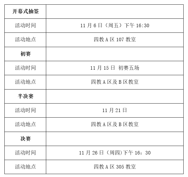 1.各小班宣传委员带领本班参与小班赛的同学于11月6日下午16:30在4教A区107由宣传委员上台抽签决定初赛对手、辩题持方以及领队。