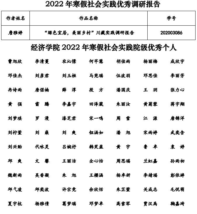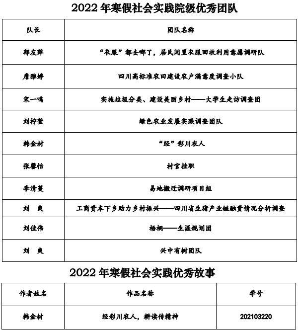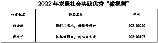 根据校团委《关于开展2022年学生寒假社会实践总结表彰的通知》,经过个人自荐、学院相关部门评议,团队申请、答辩,学院团委评审,拟表彰以下团队和个人,现予公示如下。