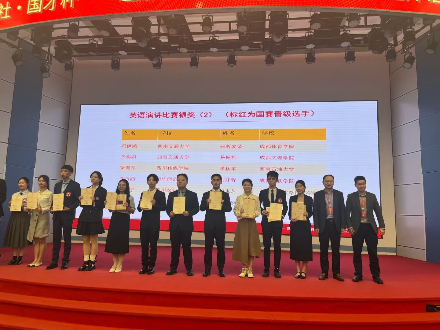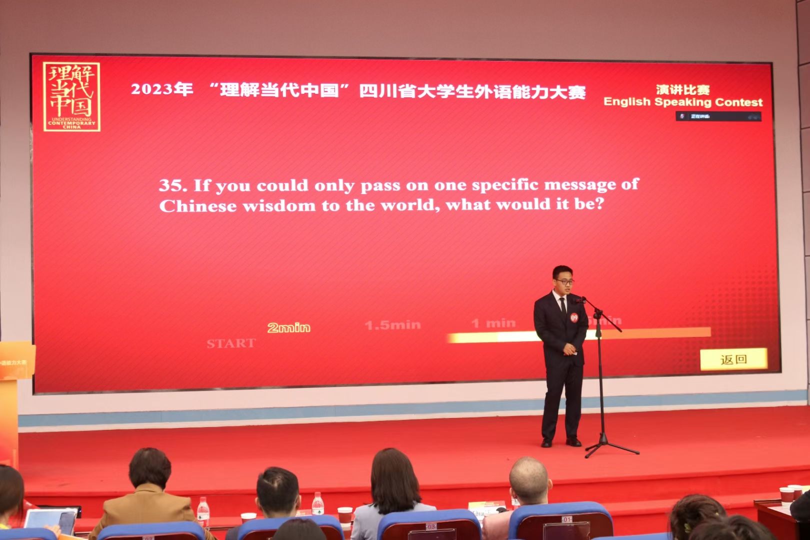 11月4-5日,由四川省教育厅主办,四川省普通本科高校外国语言文学类专业教学指导委员会、外语教学与研究出版社合办,四川大学承办的2023年“外研社.国才杯”“理解当代中国”四川省大学生外语能力大赛决赛在四川大学进行。我院投资学2022级1班学生蔡博宇荣获演讲组省级银奖,并将于今年12月代表四川省参加在北京举行的总决赛。