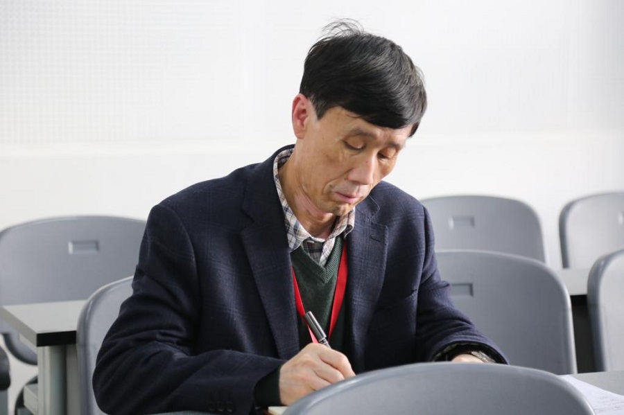 12月3日下午,专家组成员、云南农大党委书记吴伯志在听《国际经济学》课时认真作笔记