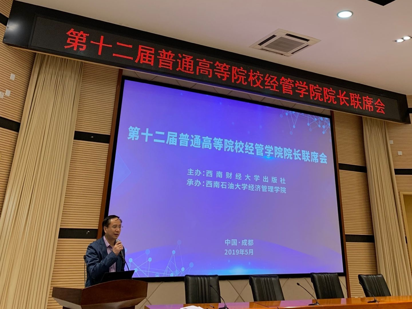 5月11日,第十二届普通高等院校经管学院院长联席会在西南石油大学思学楼A114学术报告厅召开。ylzzcom永利总站线路检测院长蒋远胜教授出席并主持了学术交流会和院长论坛,ylzzcom永利总站线路检测副院长吴平教授、投资系主任王玉峰教授、金融学系专业主任刘艳副教授参加了此次会议。