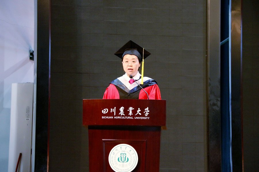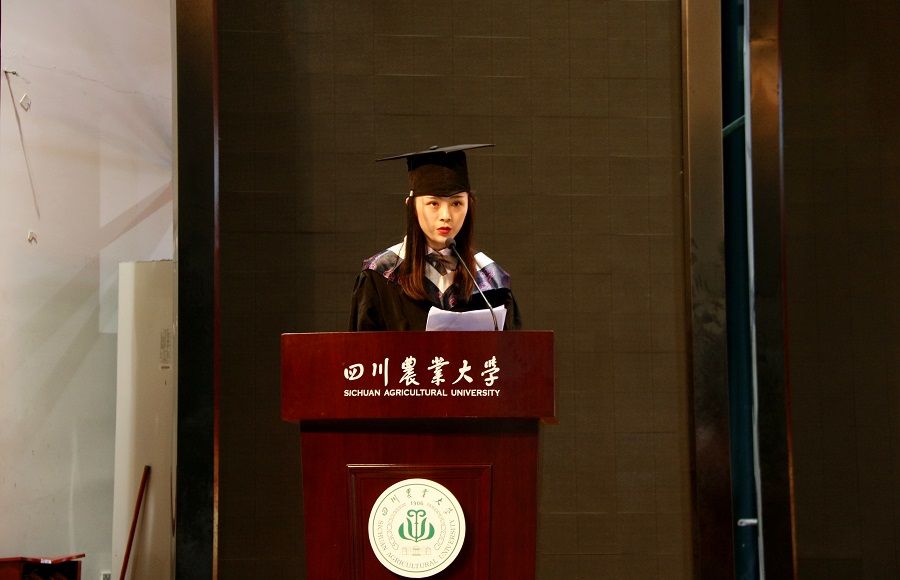 毕业生代表投资专业张椿丹深情回忆了大学四年充满温暖和奋斗的生活,总结自己的收获并对未来做出规划。她希望毕业生都能牢记:“‘追求真理,造福社会,自强不息’的川农大校训,带着川农人、经济人的自信和勇敢,迎接未来生活中的种种挑战。永远不忘那群‘仰望星空,脚踏实地’的朋友,那份‘不忘初心,砥砺前行’的担当,那些‘心有猛虎,细嗅蔷薇’的理想,和那段‘务实果敢,不失浪漫’的疯狂。”最后她代表2019届ylzzcom永利总站线路检测全体本科毕业生深切感谢四川农业大学和ylzzcom永利总站线路检测提供的平台,感谢领导的真心关怀和和老师的辛勤培养,祝愿学校和学院都能蓬勃发展,老师们都平安健康,工作顺利。