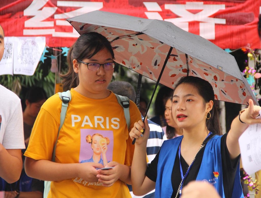 手写的“生日礼包”、《学生及家长联系卡》、撑起爱心伞、发放饮用水、纸巾,他们用自己的实际行动为迎新点增添了一抹亮丽的红色,为403名新生上了一堂生动的入党启蒙课。