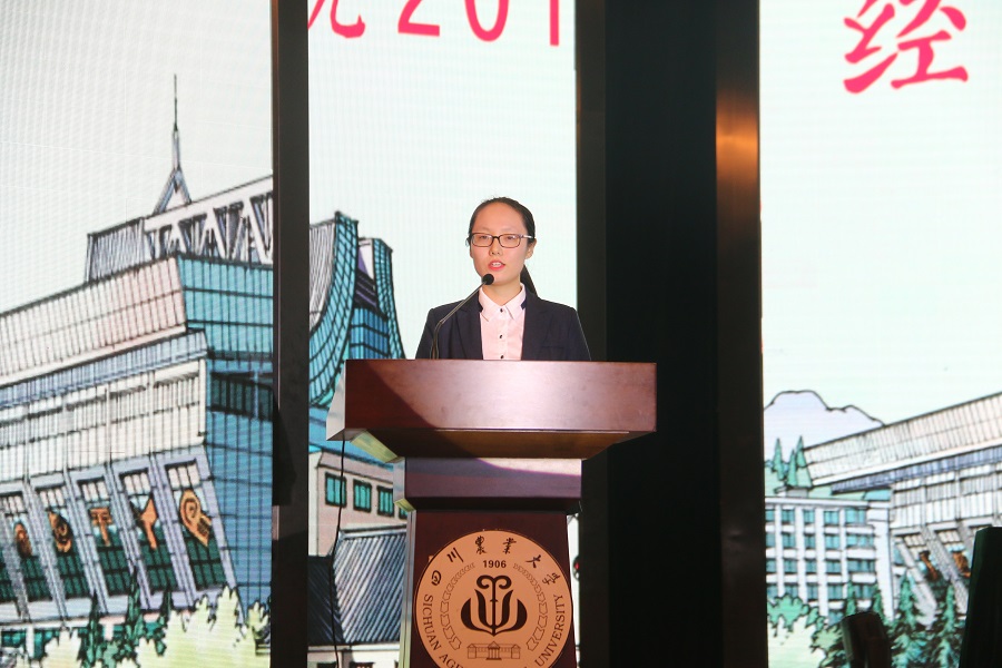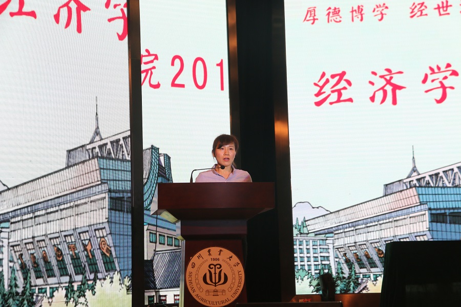 高年级学生代表、经济201801的楼宇晴发言。她勉励2019级的新同学,怀着初心去认真把握四年的大学时光,用心去感受“追求真理、造福社会、自强不息”的川农校训,用行动去传扬“厚德博学,经世济民”经院荣光。