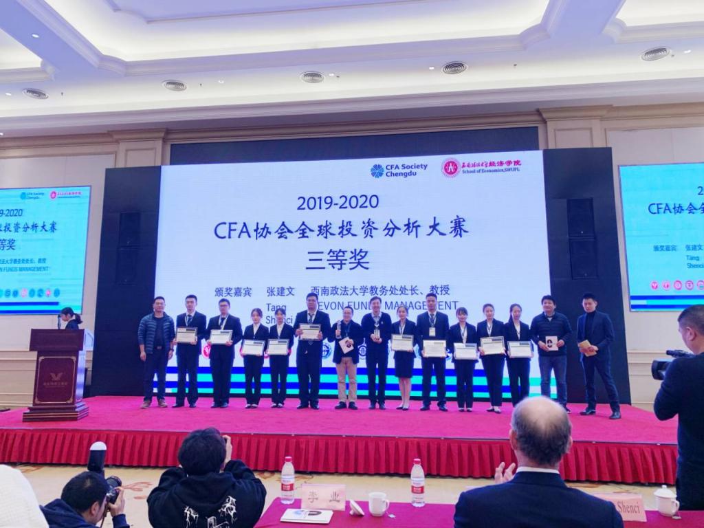 12月27日至28日,由CFA协会主办、西南政法大学承办的2019-2020“CFA全球投资分析大赛(CFA Institute Research Challenge)”中国中西部赛区决赛在重庆维也纳国际酒店举行。来自贵州大学、西南政法大学、西南财经大学等15所高校的22支队伍同台竞技。最终,我校代表队斩获比赛三等奖(第三名),我院荣获优秀组织奖。