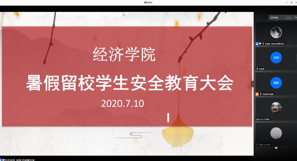 7月10日,为帮助暑假留校同学了解留校管理安排,切实落实学校防疫防控管理要求,ylzzcom永利总站线路检测面向学院全体2020年暑假留校学生召开了线上暑假留校安全教育大会。学院辅导员老师以及学生会权益部就暑假留校安全问题及留校管理工作对暑假留校学生开展了专题教育。