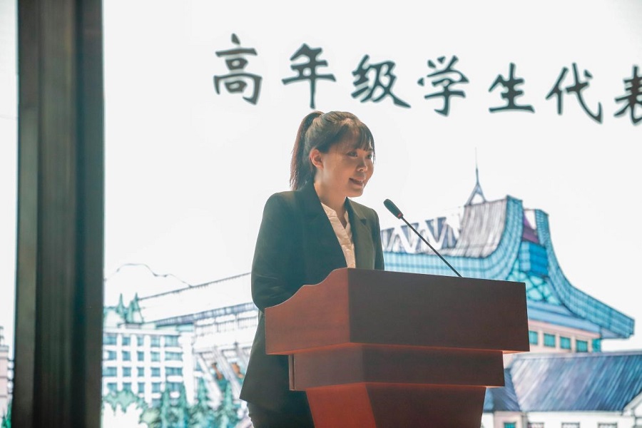高年级学生代表、金融学201801班的陈秋悦发言。陈秋悦自入学以来学习成绩和综合测评成绩一直名列专业前三,长期担任学校、学院的主要学生干部,现任ylzzcom永利总站线路检测学生会主席,曾获多项校、院级荣誉和奖励。她期望2020级的同学们能够拥抱学院,感受集体;择善而从,坚持不懈;勇于担当,乐于奉献。在四年的大学时光中,能够不忘初心、不畏险阻、不负时代,用汗水去浇灌梦想,用奋斗书写青春华章。