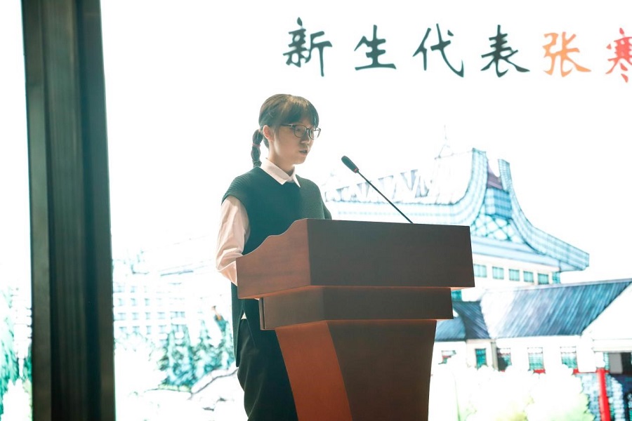 新生代表、投资学202002班的张寒放发言。她回望了从高中走入川农的点滴岁月,同时展望了无限可期的未来四年。她表示,愿2020级同学们都能在四年的求学生涯中,做好规划,学好专业知识,提升综合素质,提升国际视野,培养家国情怀,努力成为德智体美劳全面发展的“川农大精神”新传人。