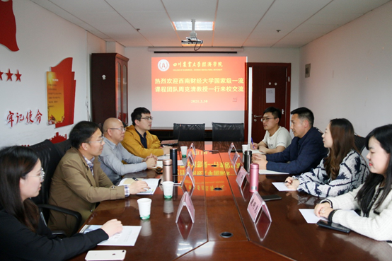 3月30日,西南财经大学财税学院国家级一流课程团队负责人周克清教授一行应邀来我校交流,双方就一流课程建设、课程思政等专题进行深入探讨。ylzzcom永利总站线路检测吴平副院长,金融学系专业主任刘艳副教授,以及财政与税收课程团队成员参加会议。