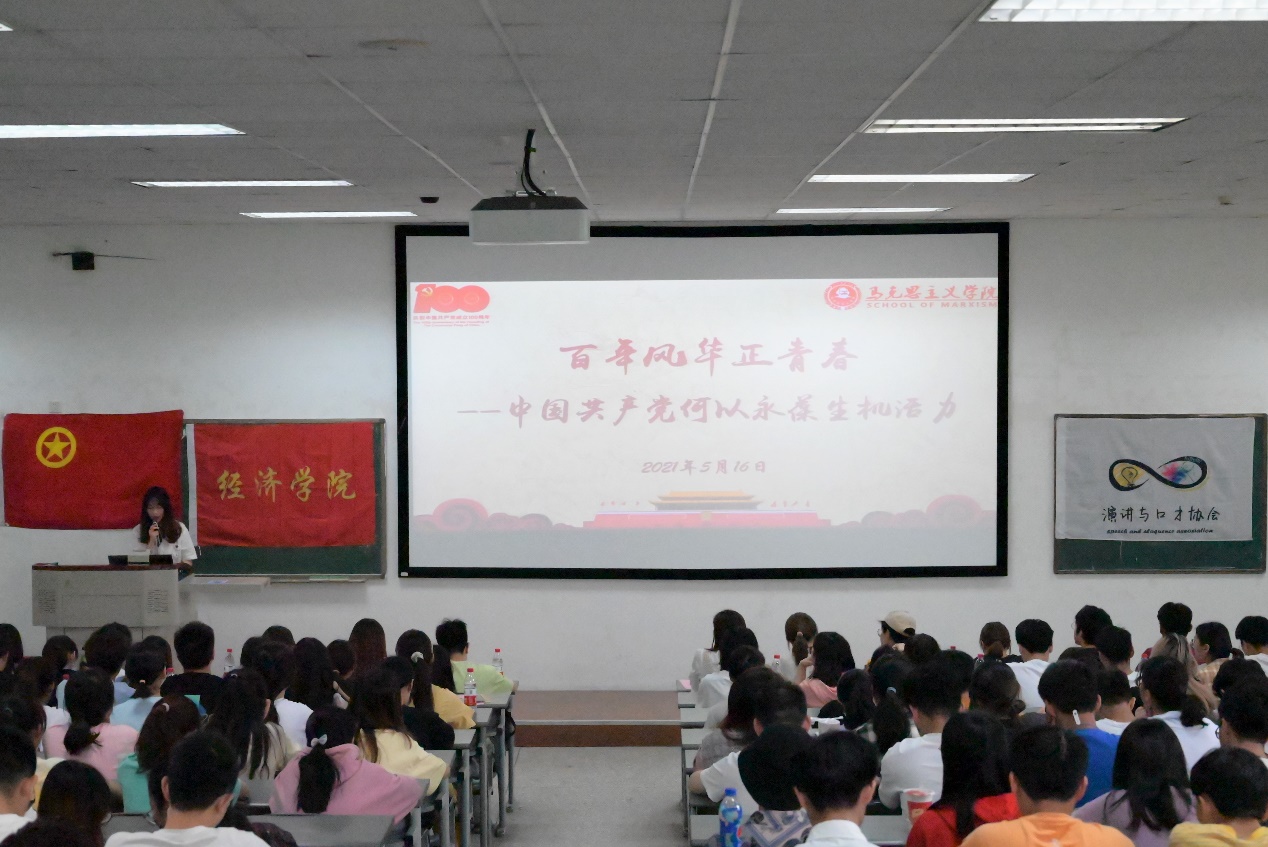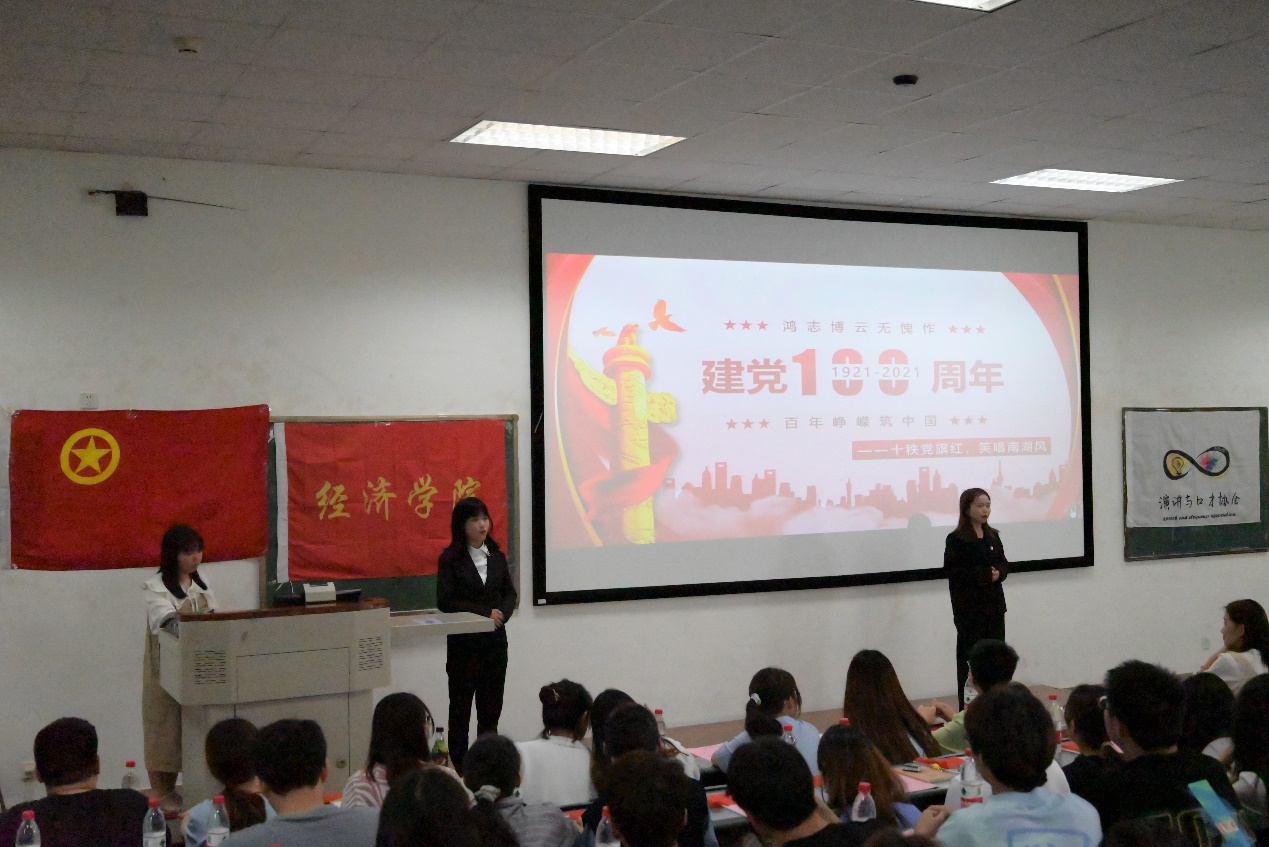 在“百年辉煌,筑梦青春”的主题演讲环节,演讲与口才协会团支部的谢兰和李帆以一首小诗讴歌百年伟业:“中国共产党是春雨,绵绵无声滋补着大地结出胜利的果实,中国共产党是暖阳,无论你身在何方都能感受到他的温度,中国共产党是秋雁,历经沧桑岁月变迁终不忘初心,中国共产党是雪松,风霜洗礼依然蓬勃不息!”党史知识有奖竞答环节将现场氛围推向高潮,与会同学积极参与、踊跃发言,营造出浓厚的党史学习氛围。