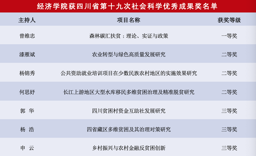 日前,《川观新闻》和四川省社科联官方网站公告了四川省第十九次社会科学优秀成果奖获奖名单,我院共有主持的7项研究成果获奖,其中一等奖1项、二等奖3项、三等奖3项。由申云博士、徐斌博士、郭丽丽博士参与3项获二等获。获奖名单有:曾维忠教授、杨锦秀教授、漆雁斌教授、何思妤教授、郭华副教授、杨浩副教授、申云博士,详细获奖名单如下:
